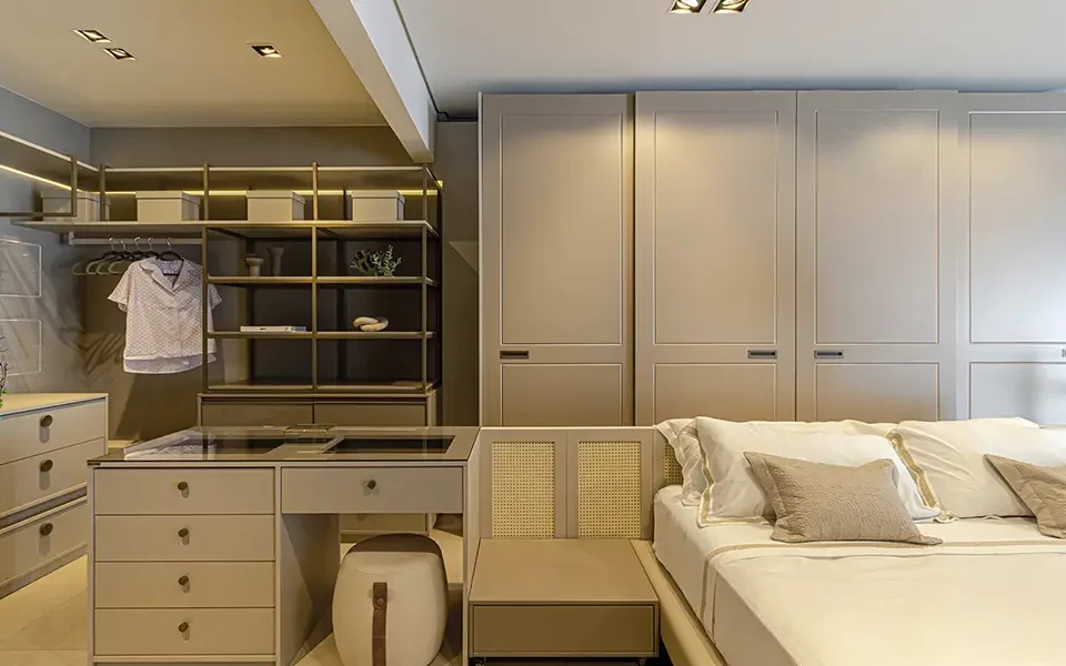 O closet clean se destaca pela neutralidade visual e sensação de ordem. Cores claras, poucos contrastes e superfícies contínuas criam ambiente leve, organizado e fácil de manter.