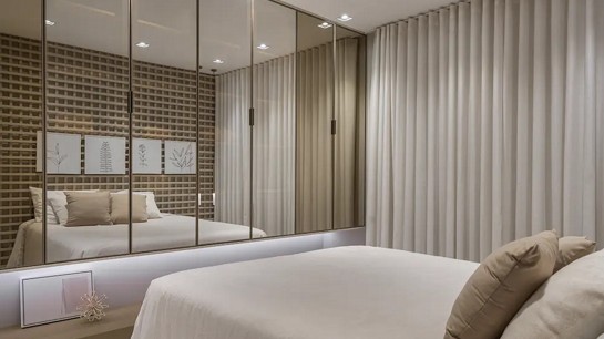 Nos dormitórios e closets, a personalização interna traduz essa mesma inteligência. Gavetas com divisórias específicas, módulos ajustados à altura de cabides longos, compartimentos dedicados a acessórios e iluminação embutida acionada automaticamente tornam o uso intuitivo. O móvel planejado deixa de ser apenas estrutura de armazenamento e passa a funcionar como extensão da rotina, antecipando necessidades e reduzindo esforço.